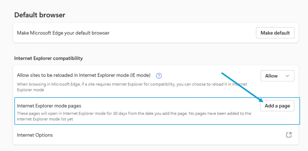 Under 'Internet Explorer Mode Pages', click 'Add Page'