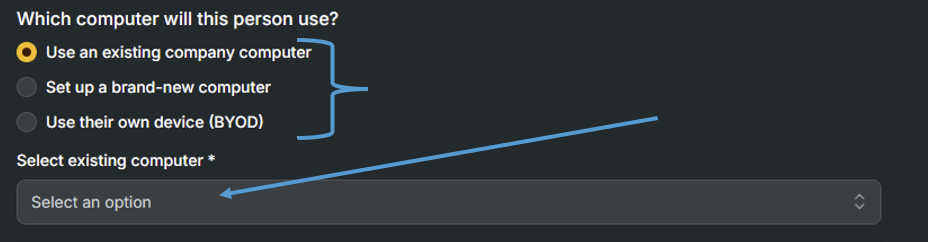 7. Designate a work computer for the new user (Either existing, or brand new). If it is an existing computer choose which one from the drop down