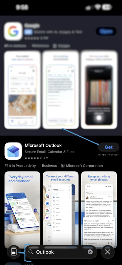 Search for 'Outlook' In the App Store search bar, Click 'Get' to download.
